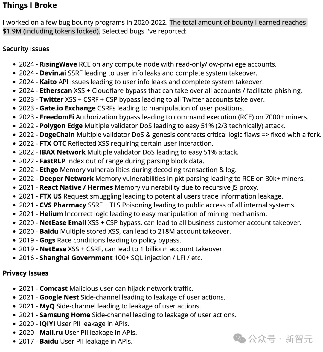 他的个人主页上有一个叫「Things I Broke」的栏目,密密麻麻排了三十多条记录,读起来像一份硅谷安全圈的「通缉名单」,只不过角色反过来了,被通缉的是那些漏洞。