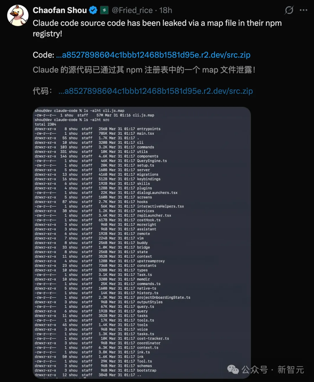 3月31日凌晨4点23分,安全研究员Chaofan Shou在X上甩出一句话——