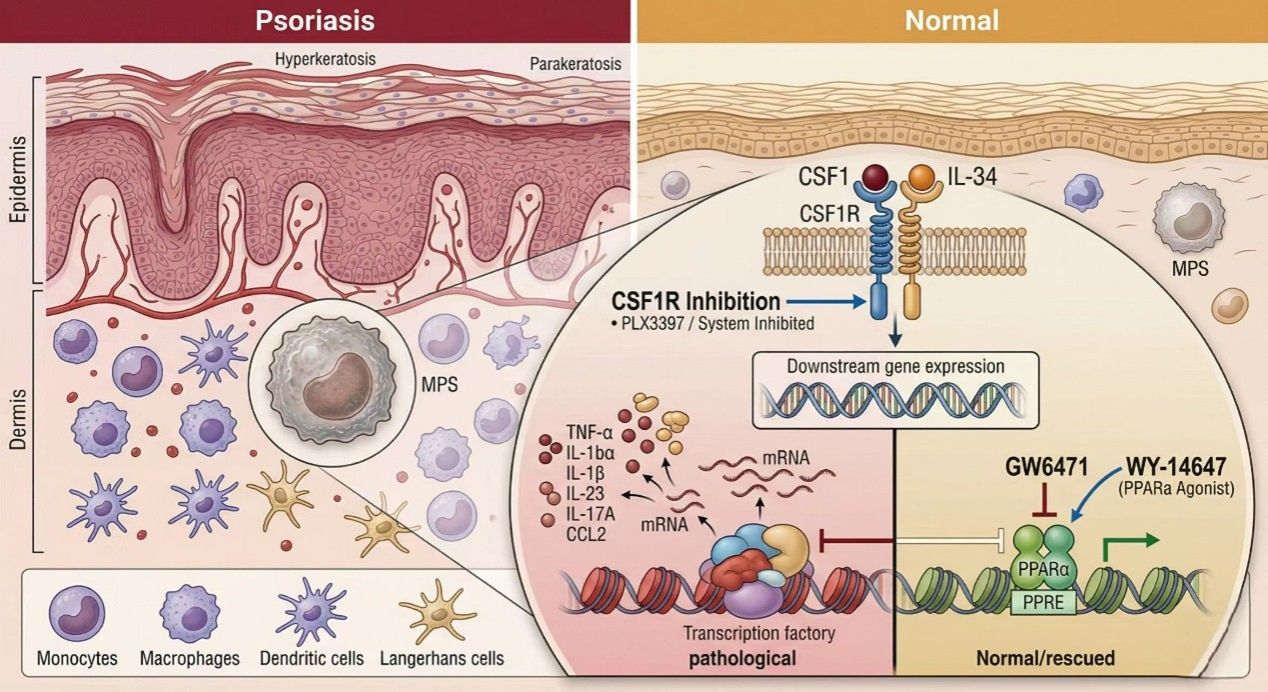 在分子机制层面,研究团队明确了CSF1R-PPARα的单向致病轴。CSF1R的过度激活会直接抑制过氧化物酶体增殖物激活受体α(PPARα)——一种关键的炎症刹车分子。当使用抑制剂阻断CSF1R后,PPARα重新发挥功能,主动介导炎症的消退。若使用拮抗剂阻断PPARα,CSF1R抑制剂的抗炎效果将完全丧失,证明PPARα是CSF1R下游不可或缺的效应分子。 该研究从单细胞精度重新定义了CSF1RhighMPS在顽固性炎症中的核心地位,率先提出CSF1R-PPARα轴作为银屑病的关键致病通路,并揭示了系统性干预的不可替代性。这一发现为开发既能清除致病细胞储库、又能主动诱导炎症消退的双效靶向治疗策略奠定了坚实基础。