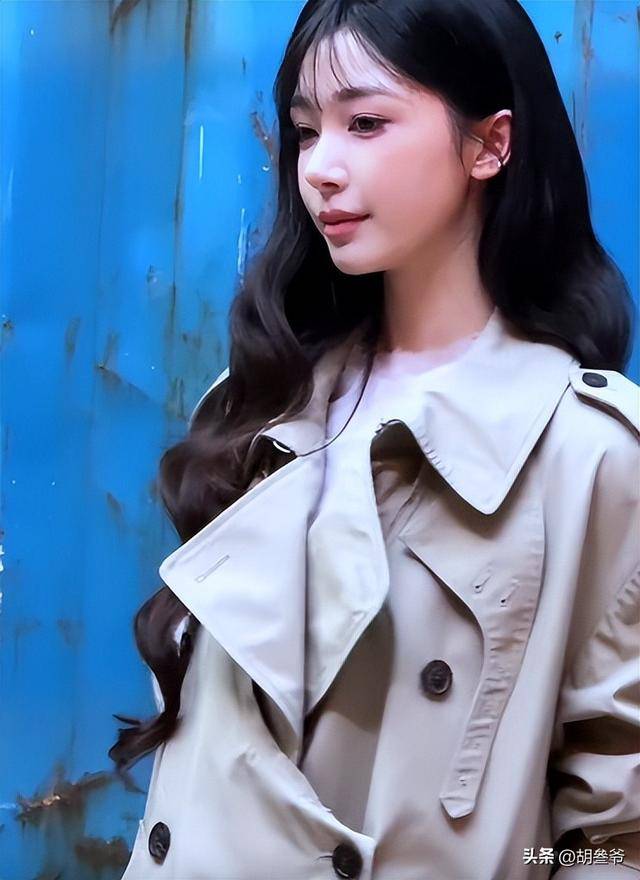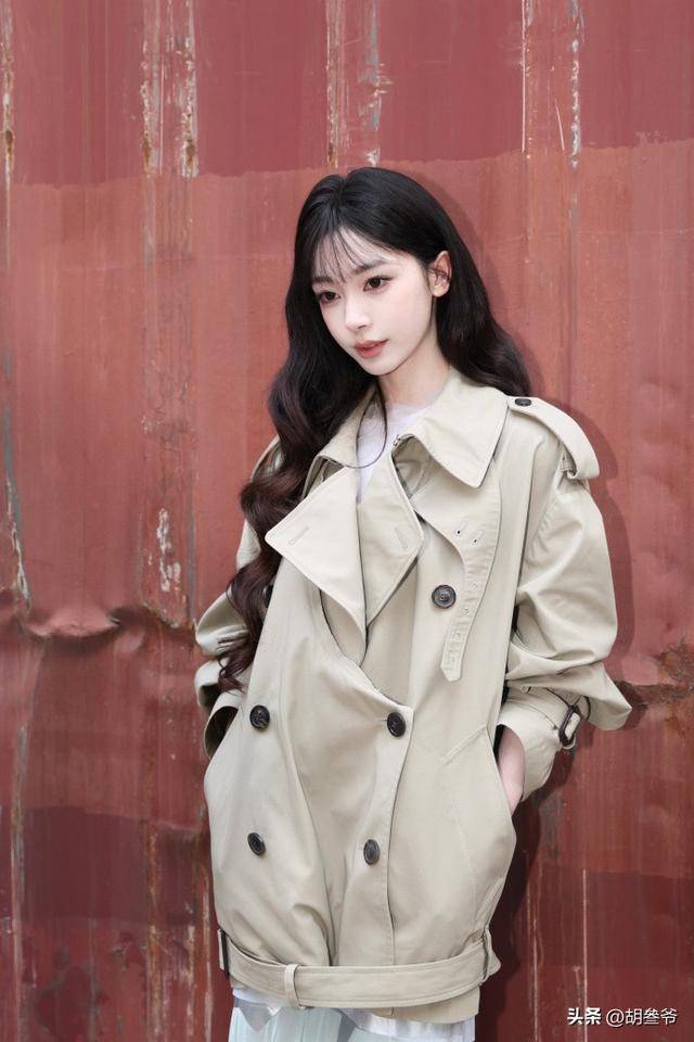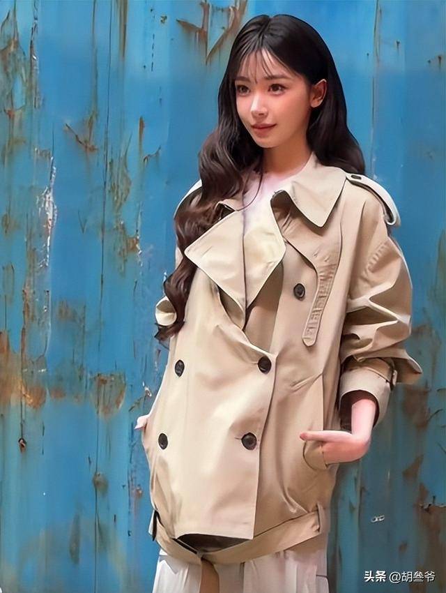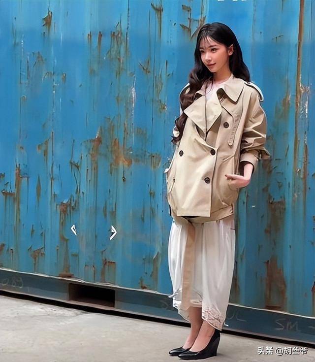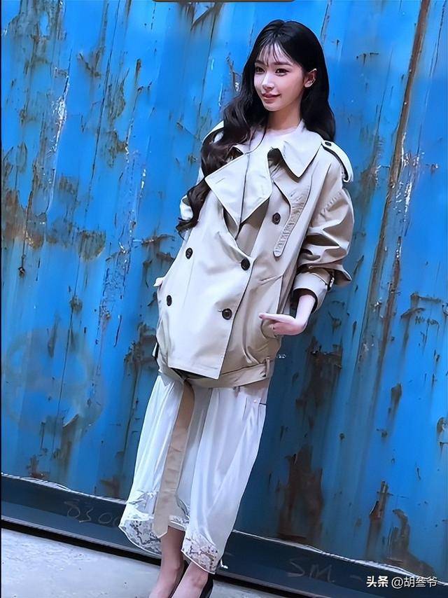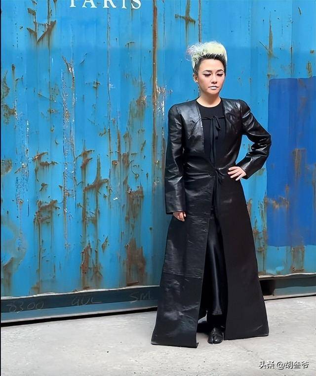 她穿了一件黑色拖地风衣,皮质面料硬挺,完全没有腰线,整个人裹在里面,身材直接变成直筒H型,男女气质模糊,看着特别像男扮女装。