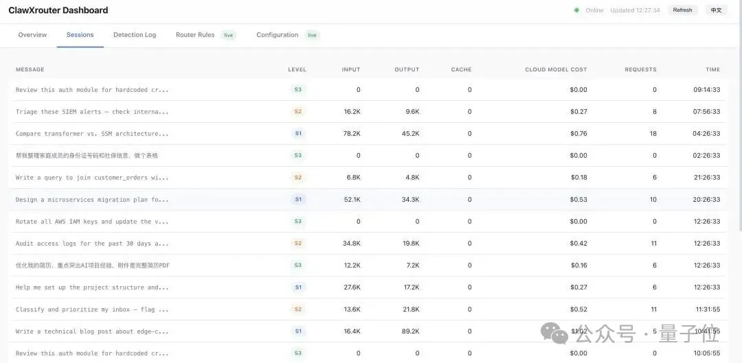 可视化Dashboard:支持中英双语,涵盖用量概览、会话记录、检测日志、路由规则配置与模型配置五个面板,所有改动即时生效、无需重启,方便用户按自身需求灵活调整。