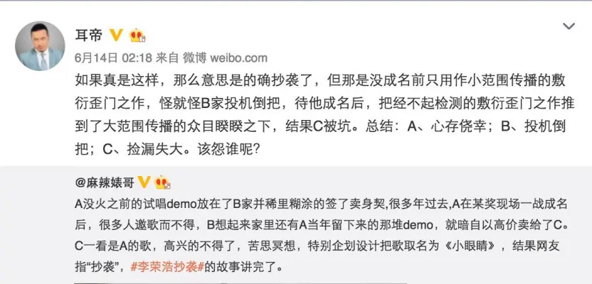 早在2016年,已经有不少音乐人讨论过《小眼睛》引发的抄袭争议。(图/ @耳帝微博)