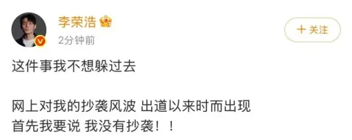 耐人寻味的是,这篇回应抄袭的长文的文末写着“别去找单依纯粉丝这不是她粉丝做的”,颇有些“此地无银三百两”的意味。(图/ @李荣浩微博)
