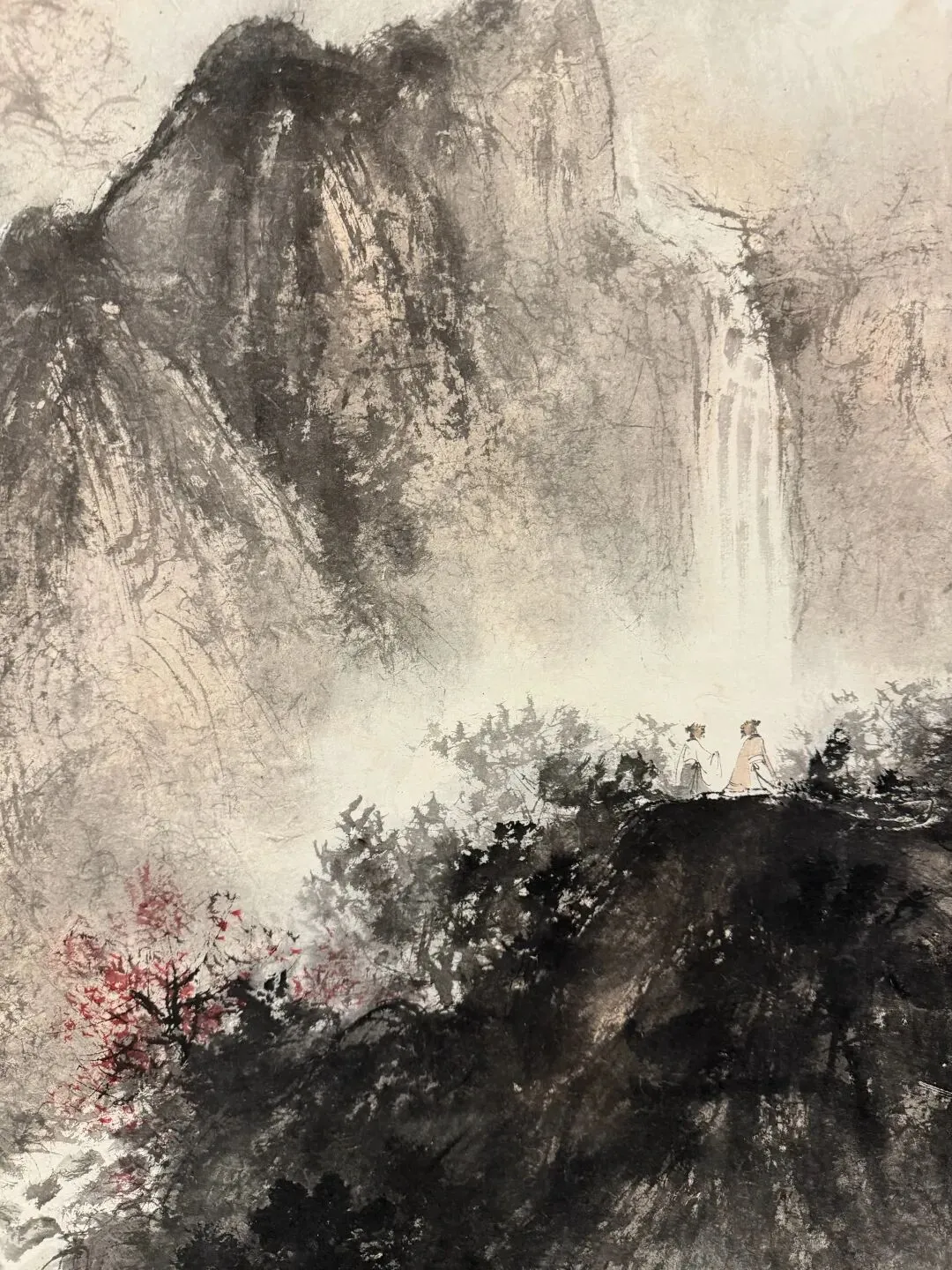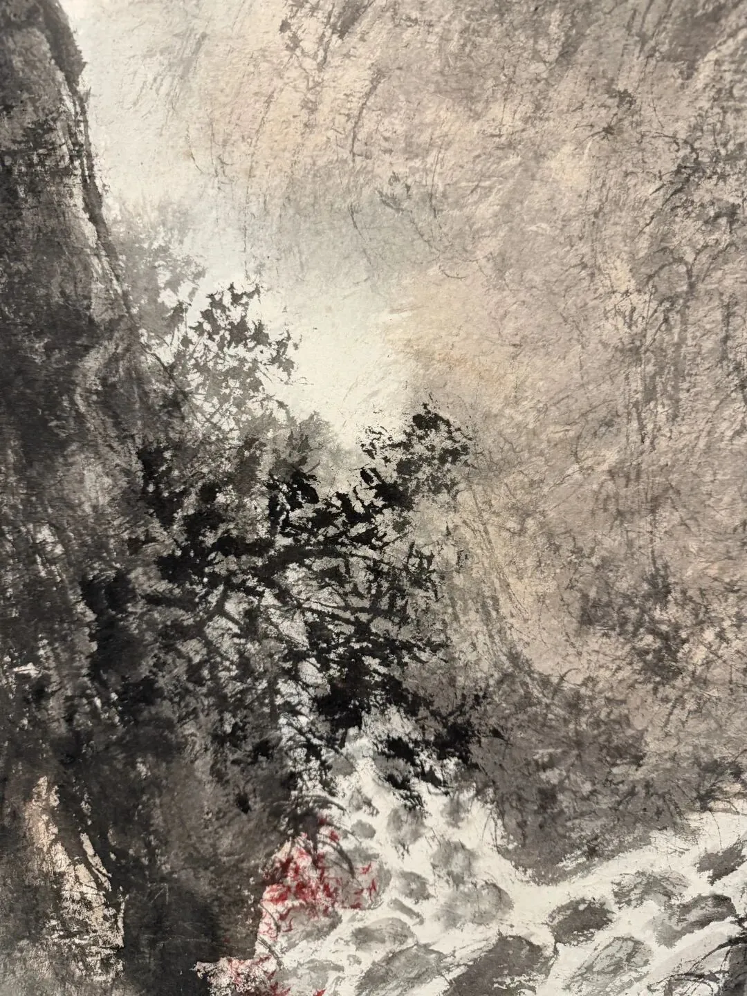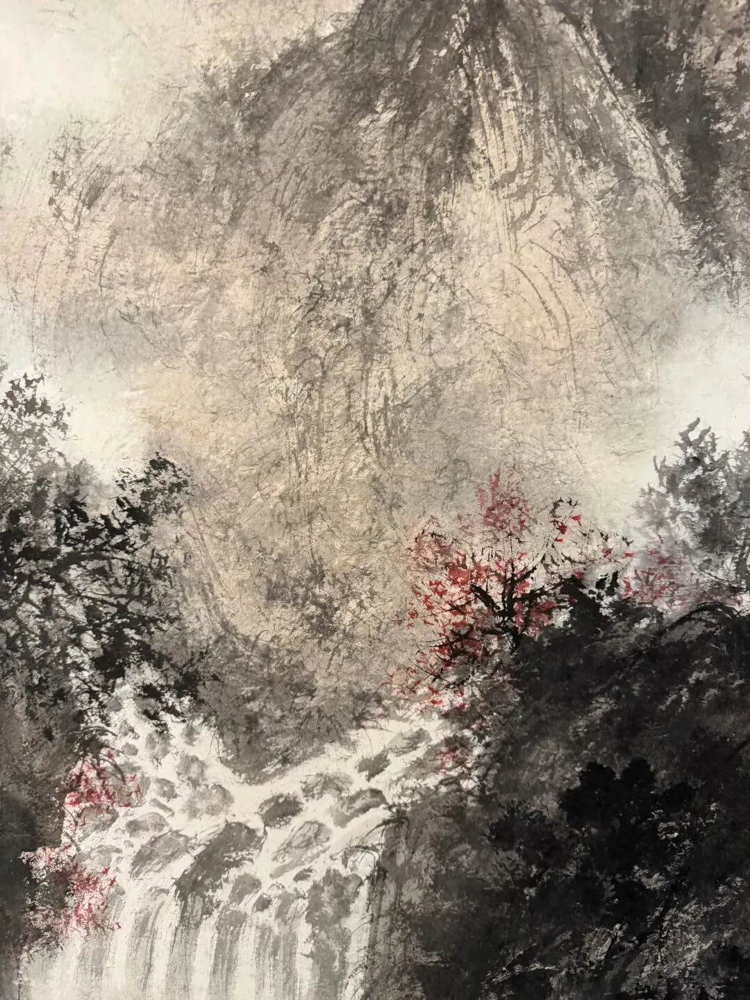还有那几抹红,在满山黑墨里蹦出来,一下就活了。不是大红大绿,是点点朱砂,给这满是力量的画,添了点活气儿,就像瀑布溅起的水花里,藏着点温柔。