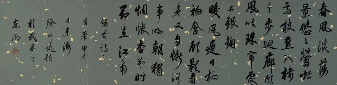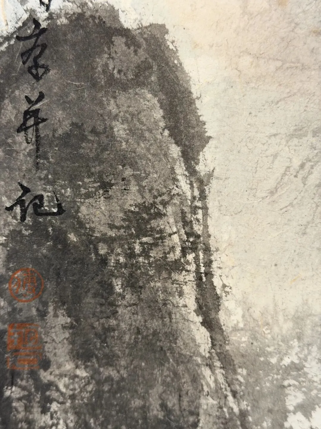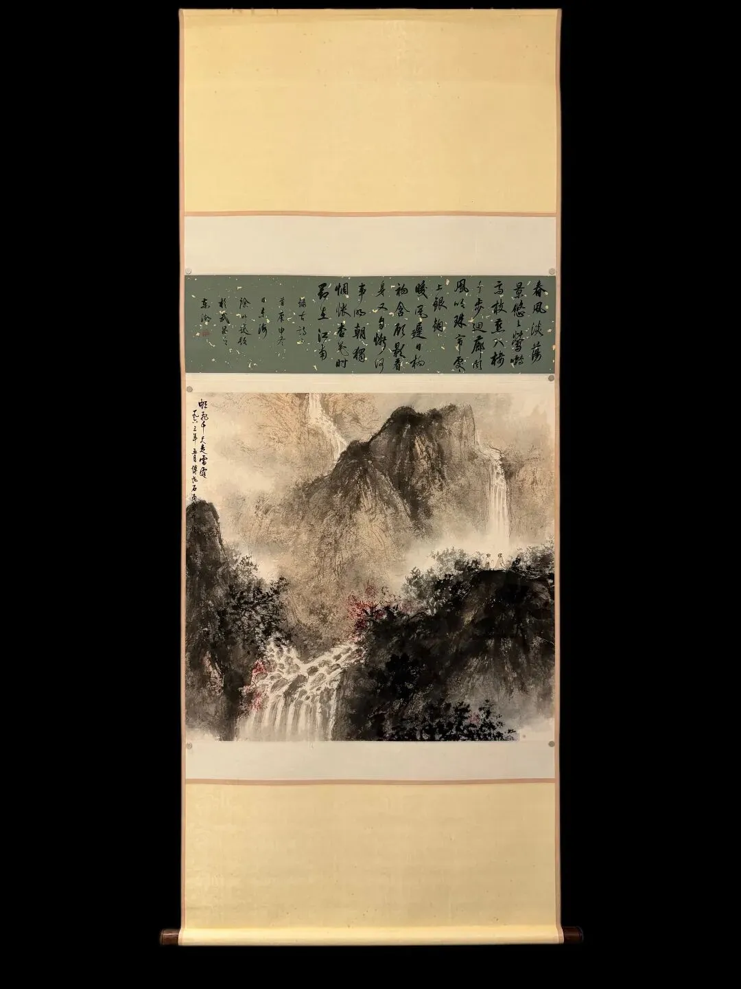 还有那几抹红,在满山黑墨里蹦出来,一下就活了。不是大红大绿,是点点朱砂,给这满是力量的画,添了点活气儿,就像瀑布溅起的水花里,藏着点温柔。