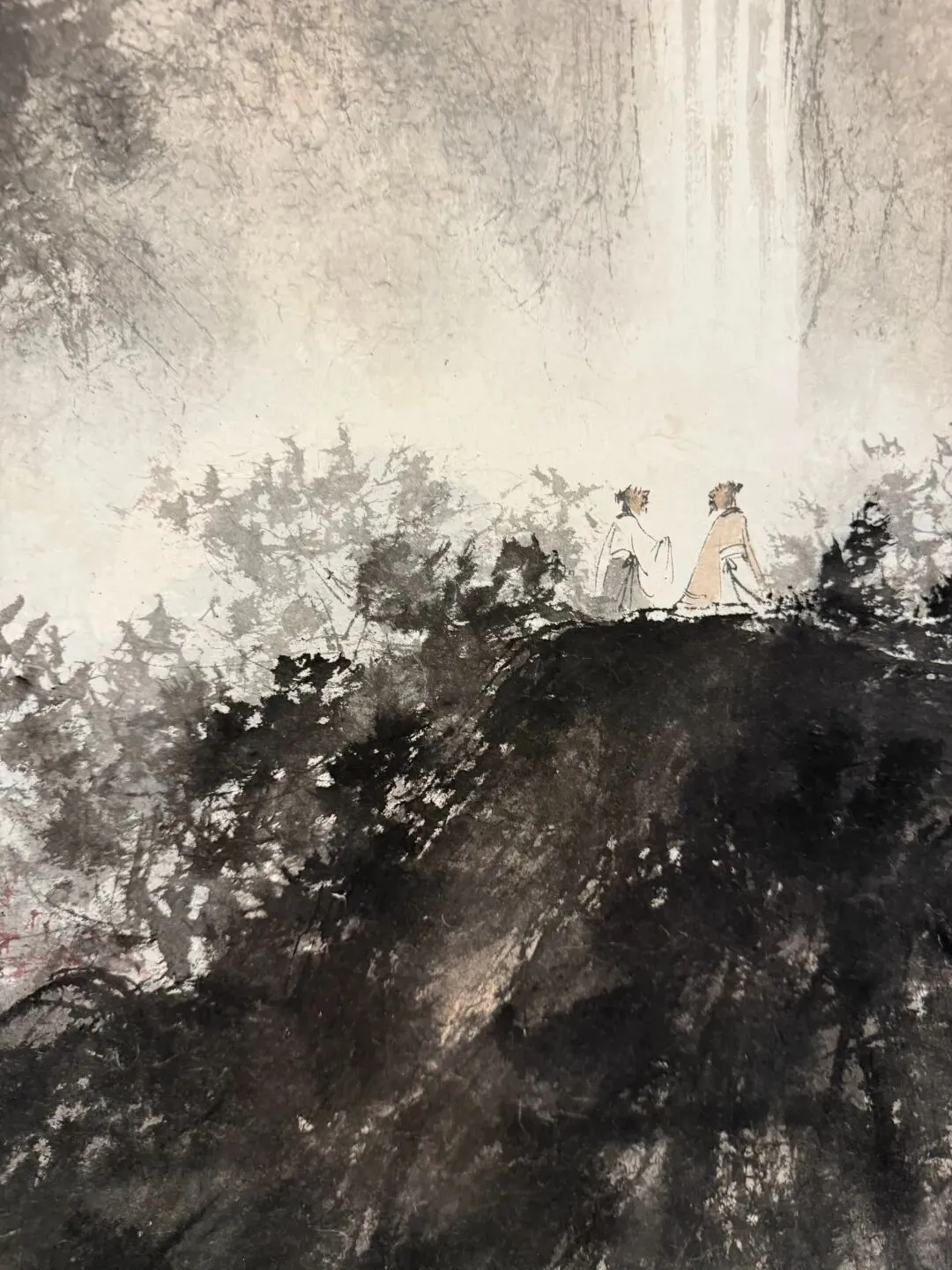 山用的是傅抱石最绝的 “散锋乱笔”,看着是一顿乱抹,其实全是劲儿。浓墨重彩把山的厚重、险峻全堆出来了,跟瀑布的白亮形成死对比,一眼就被水给抓住了。