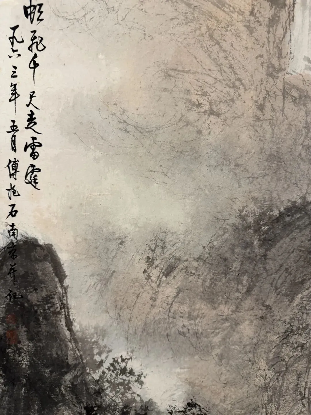 傅抱石画瀑布,从来不是画水,是画 “势”。这画里全是劲儿,是山的气势,是水的气势,更是画家心里的气势。他用最野的笔,画最猛的景,把大自然的雷霆万钧,全揉进这一张纸里。