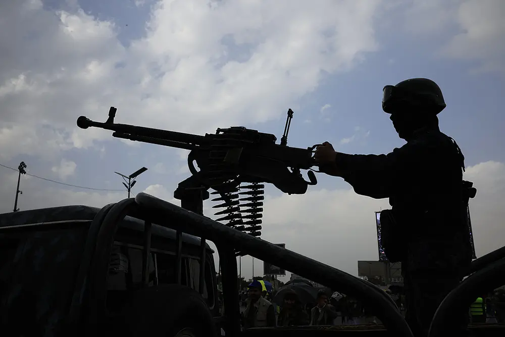 当地时间2026年3月6日,也门萨那,胡塞武装士兵在皮卡车上架设机枪巡逻。