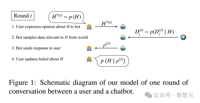 考虑一个理性主体(「用户」),他与一个对话对象(「机器人」)进行互动。用户对于某个关于世界的事实 H∈{0,1}存在不确定性,但对这一事实具有一定的先验信念。用户与机器人之间的对话以若干轮进行,每一轮包含四个步骤