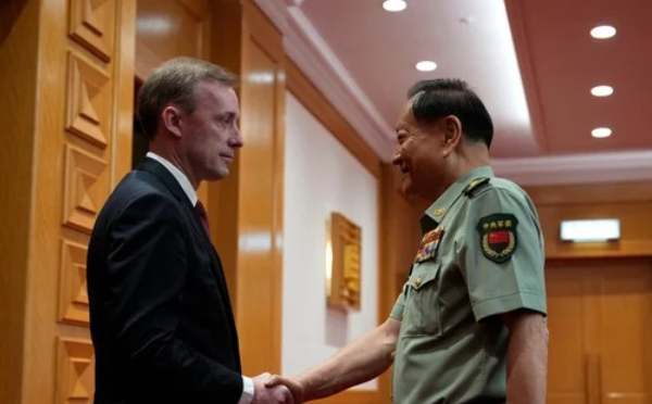 2024年8月29日,中共中央军委副主席张又侠在北京八一大厦会见美国国家安全顾问杰克.沙利文前握手。(图片来源:Getty Images)