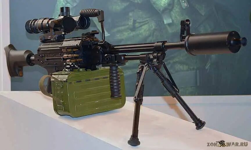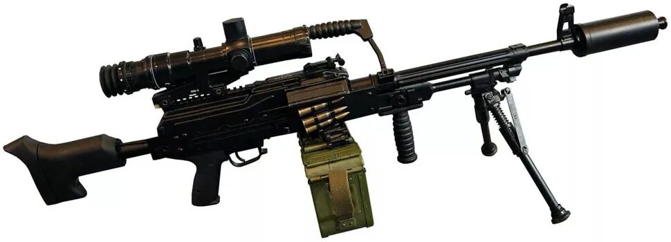 ▲加装消音器,垂直握把和光学瞄准镜的PKP-SP轻机枪