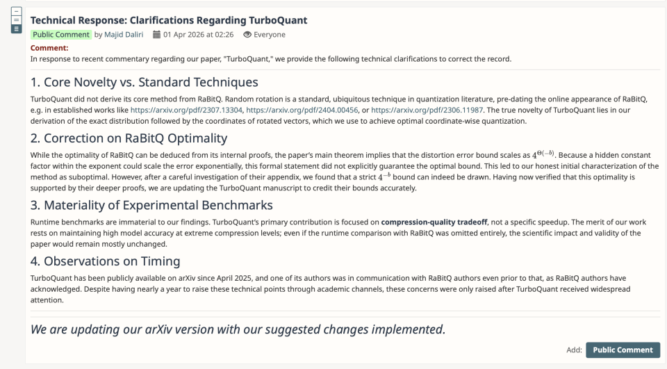 4月1日,在沉默了近一周后,谷歌引发争议的压缩算法TurboQuant论文团队终于回应了。然而,这一最新的“技术澄清”看起来仍未平息争议,针对“核心技术相似性”的指控,谷歌辩称随机旋转是标准技术,并认为实验基准中的错误对事实“并不重要”。