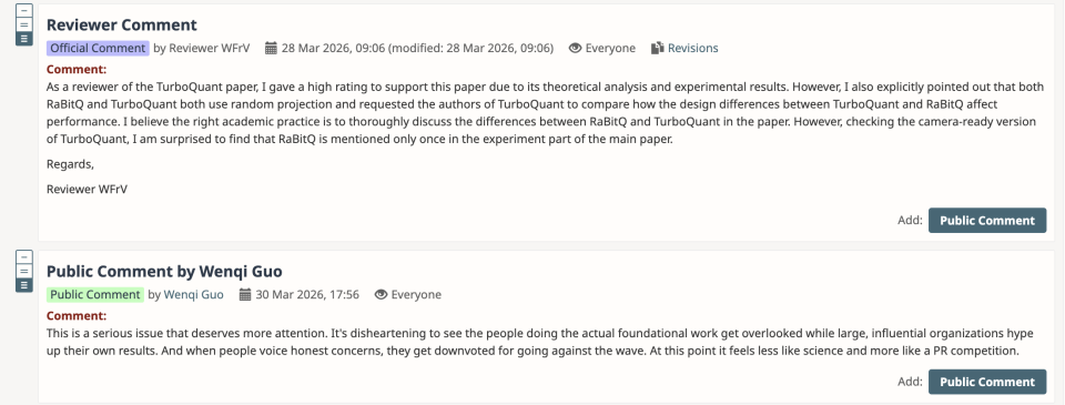 “然而我也明确指出,RaBitQ和TurboQuant都使用随机旋转,并要求TurboQuant的作者比较TurboQuant和RaBitQ之间的设计差异如何影响性能。”这位审稿人表示,正确的学术实践是在论文中深入讨论RaBitQ和TurboQuant之间的差异,但审稿时“惊讶地发现RaBitQ在主论文的实验部分只提到过一次”。