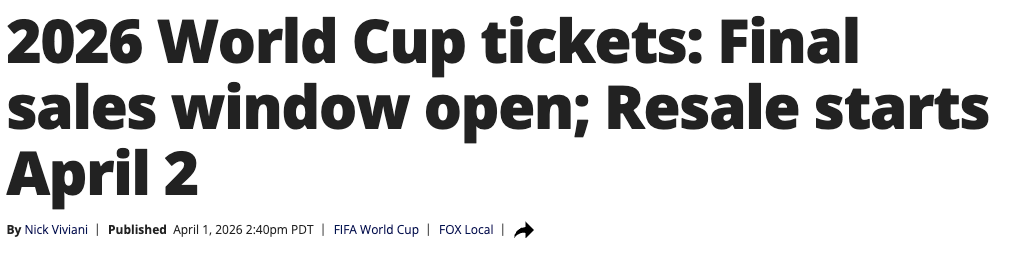 据4月1日报道,对于尚未购得2026年国际足联世界杯(FIFA World Cup)门票的球迷而言,今夏赛事仍提供最后一次购票机会。