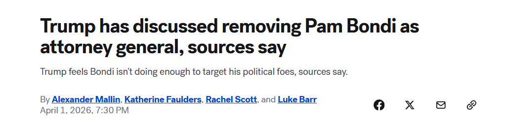 针对有关考虑撤换邦迪的报道,川普4月1日周三通过白宫发表声明称: “司法部长帕姆·邦迪是个非常出色的女性,她工作做得很好。”
