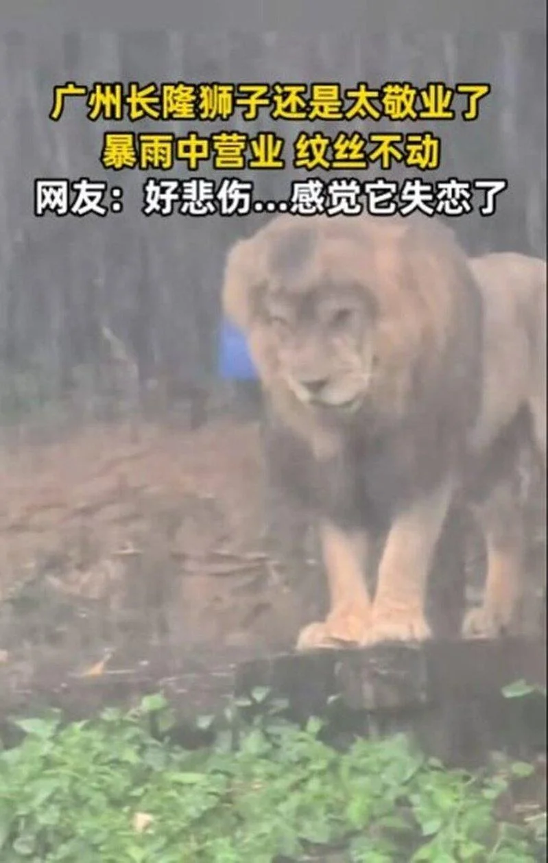 狮子也会失恋,还成了「落汤狮」?近日,广州遭受强烈对流天气侵袭,豪雨不断,位于长隆野生动物世界园区内,一头非洲雄狮被游客拍到在滂沱大雨中「黯然淋雨」,神情忧郁且纹丝不动;有网友调侃,这头雄狮像极「偶像剧中失恋淋雨的男主」,还有人说牠在「思考狮生」。相关话题一度登上热搜。