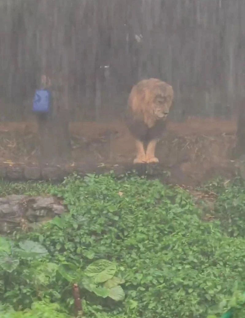 广州暴雨期间,长隆野生动物世界里的动物们,出现不同反应。例如大象结队奔跑,兴奋不已;长颈鹿匆忙避雨;一头雄狮则被发现低头站在露天展区的石头上淋雨,暴雨将牠的鬃毛淋透,形成「齐刘海」发型。最引人关注的还是牠的忧郁的神情,让不少网友脑补,「该不会跟母狮分手了」、「失恋了」、「淋雨疗情伤吗」。