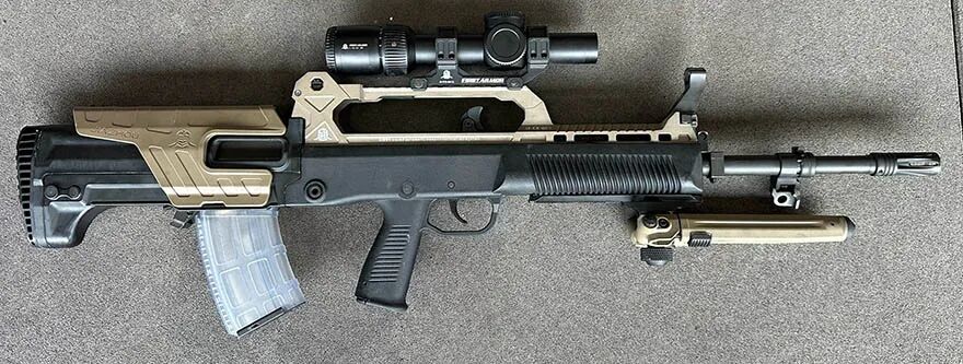 此外,贴腮板的设计使得安装瞄准镜后,增加的瞄准基线高度能够为射手提供更舒适的射击体验。为提高射击精度,特意拆卸了固定在枪管上的两脚架,改为通过皮轨安装到护木底下的两脚架,降低因为枪管中部支点受力而干扰了枪管的自由震动。另外,考虑到卧姿射击的便利性,还特意配备了20发短弹匣。