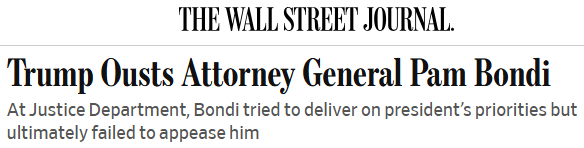 川普解雇司法部长帕姆·邦迪华尔街日报