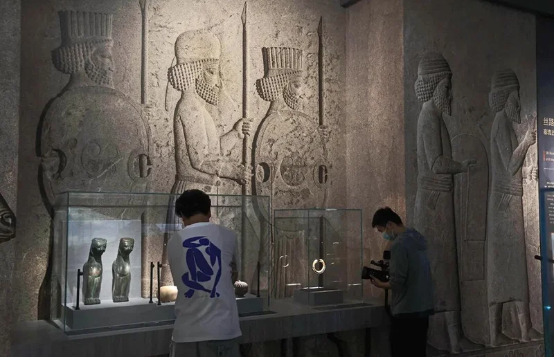 2025年7月,一批伊朗文物在南京博物院展出,展柜后的背景是波斯波利斯遗址的浮雕图案(图源:视觉中国)