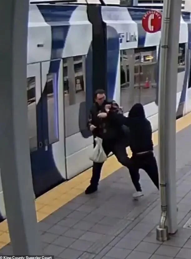 就在那一刹那,黑衣男貌似瞅准了机会,突然窜出来,从背后猛推了彼得一把,试图把他推下站台,摔到铁轨上。