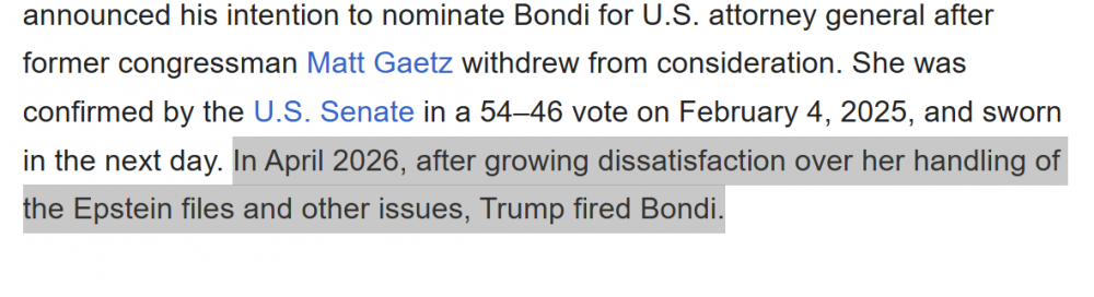 3月5日《在明州大干一番的美國國土安全部長Kristi Noem被解雇了?》,这篇下面土豆写过:以后会不会因为爱泼斯坦档案的“管理问题”,这个司法部长Pam Bondi被突然换人…… 今天,女司法部长Pam Bondi,也下台了? 维基:https://en.wikipedia.org/wiki/Pam_Bondi 尴尬,说过n次了,川普支持者中女性的奇特现象…