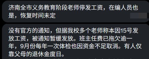 看到中国经济第三大省“济南全市义务教育阶段老师停发工资”的社交媒体截图的时候是非常震惊的,截图中提到,即便是体制内的“在编人员”,工资恢复发放的时间也无法确定。
