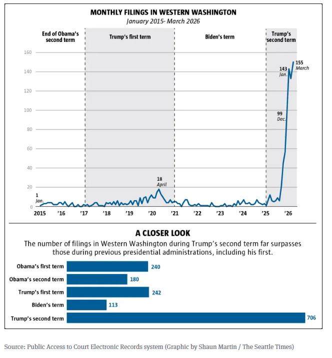 据《西雅图时报》对法院卷宗的最新调查显示,自川普开启第二任期并强力推进移民驱逐行动以来,华盛顿州西部联邦法院收到的非法拘留申诉量出现了爆炸式增长。