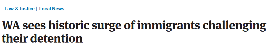 数据显示,2025年华盛顿州西部联邦法院受理的移民拘留相关申诉案件,是拜登任期最后一年的6倍以上。