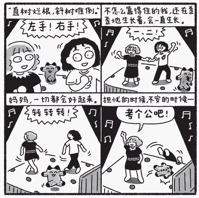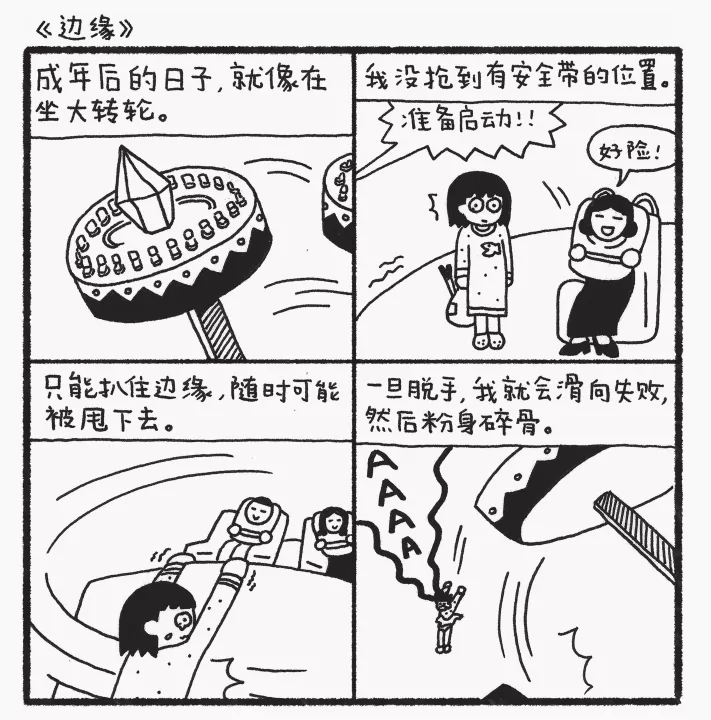 活在系统之外,或许就像杰尼丸子所画的,成年后的日子就像在坐游乐场的大转轮,她没有抢到有安全带的位置,只能扒住边缘,随时可能被甩下去,然后粉身碎骨。