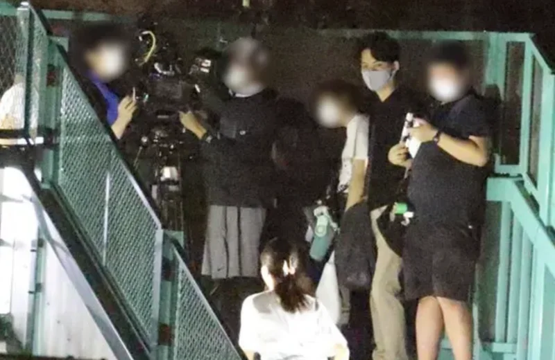 那是夏天一个闷热的夜晚,内田有纪正在东京一处天桥上拍戏。她要一遍遍跑楼梯、反复彩排,脸上戴着当时拍摄现场常见的防护面罩。等正式开拍前,她摘下面罩,柏原崇就很自然地走上前接过去,动作熟练得像已经做过无数次。