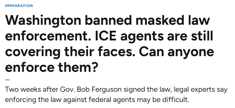 据4月2日报道,就在华盛顿州州长鲍勃·弗格森(Bob Ferguson)签署法令、严禁执法人员蒙面仅仅两周后,西雅图周边的街头画面再次触动了社区的神经。