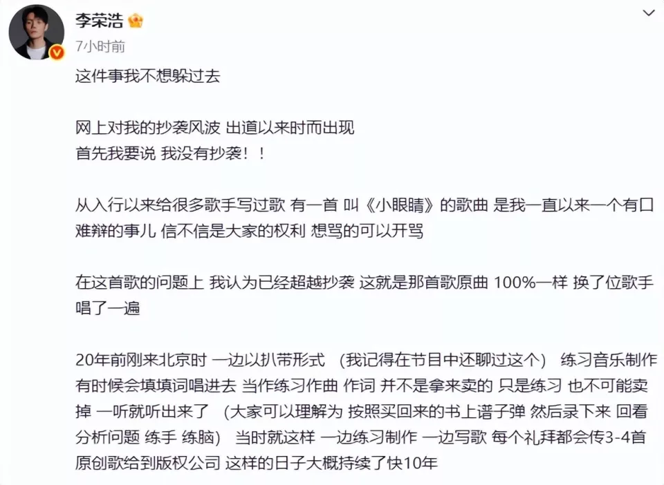 但李荣浩确实冲浪速度不慢,眼看着自己被质疑抄袭,还冲上热搜引发讨论,他赶紧再出来写一篇小作文进行回应。