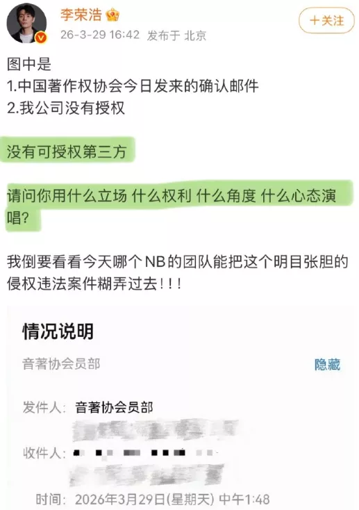 可笑的是,轮到李荣浩自己的时候,一切就是误会了,责任也归版权公司了。