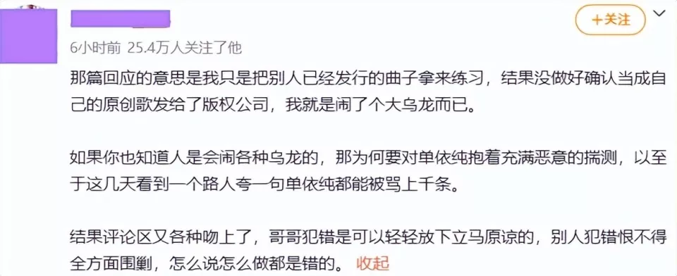其实如果不是他这次喊话单依纯,表现出了对侵权问题绝对不能容忍的态度,事情也不会持续发酵,更不会引火烧身。