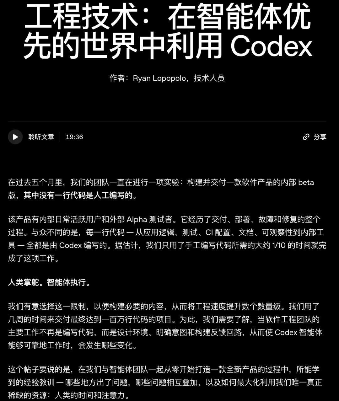 这是 OpenAI 工程师 Ryan Lopopolo 在今年二月发的一篇工程博客里记录的真实经历。三名工程师,从空仓库开始,五个月时间,一百万行代码,1500 个 PR,产品已经有真实用户在日常使用。整个过程,人类没有手动写过一行代码。