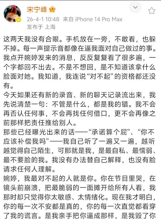 4月1日,宋宁峰发布长文致歉,直面全部过错,向妻子张婉婷、女儿以及Q女士诚恳道歉,宣布无限期暂停演艺工作。