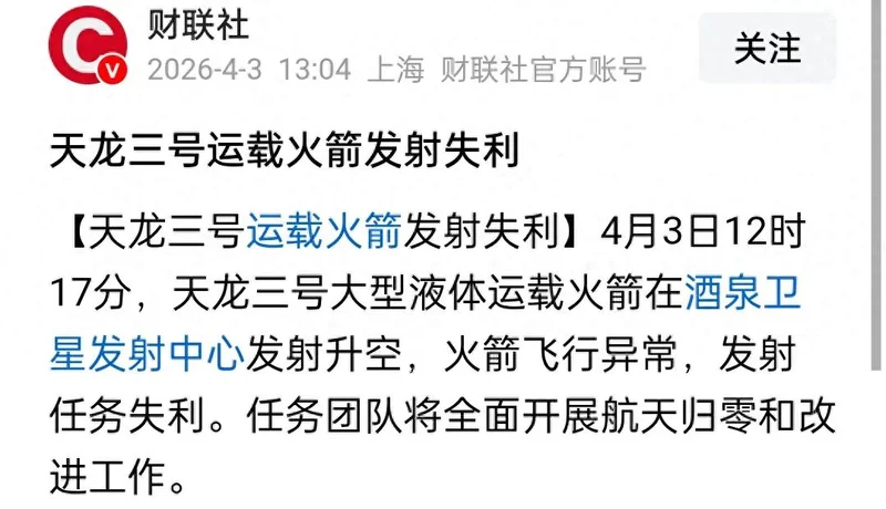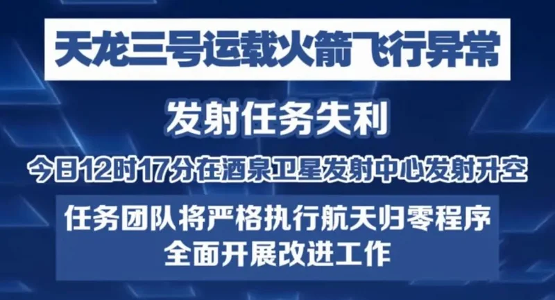 当日12时17分,被称为“中国版猎鹰九号”的天龙三号大型液体运载火箭在酒泉卫星发射中心执行首次飞行任务,但是火箭在点火升空后不久便出现飞行异常,最终未能入轨,发射任务失利。