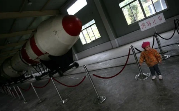 2007年10月20日,四川省西昌市一处展览厅内,一名孩童在长征三号火箭前玩耍。(图片来源:Getty Images)
