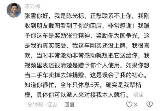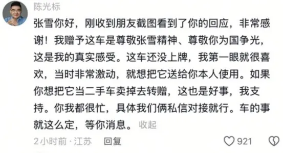 只是万万没想到张雪直接说收了然后卖掉做慈善,一向以“乐善好施”面貌示人的陈光标估计就有点招架不住了,后面的回复就有了点强行挽尊的味道,但体面还是体面的。