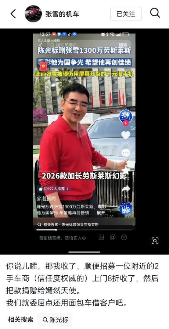 第二,陈光标打的算盘太精了。 张雪现在是舆论中心的顶流人物。如果他真的每次出去接客户,开的都是陈光标送的车,陈光标每次都能蹭一波热度,张雪变成了他的活广告。