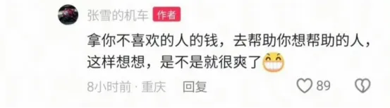 张雪还表示:“拿你不喜欢的人的钱,去帮助你想帮助的人,这样想想,是不是就很爽了。”