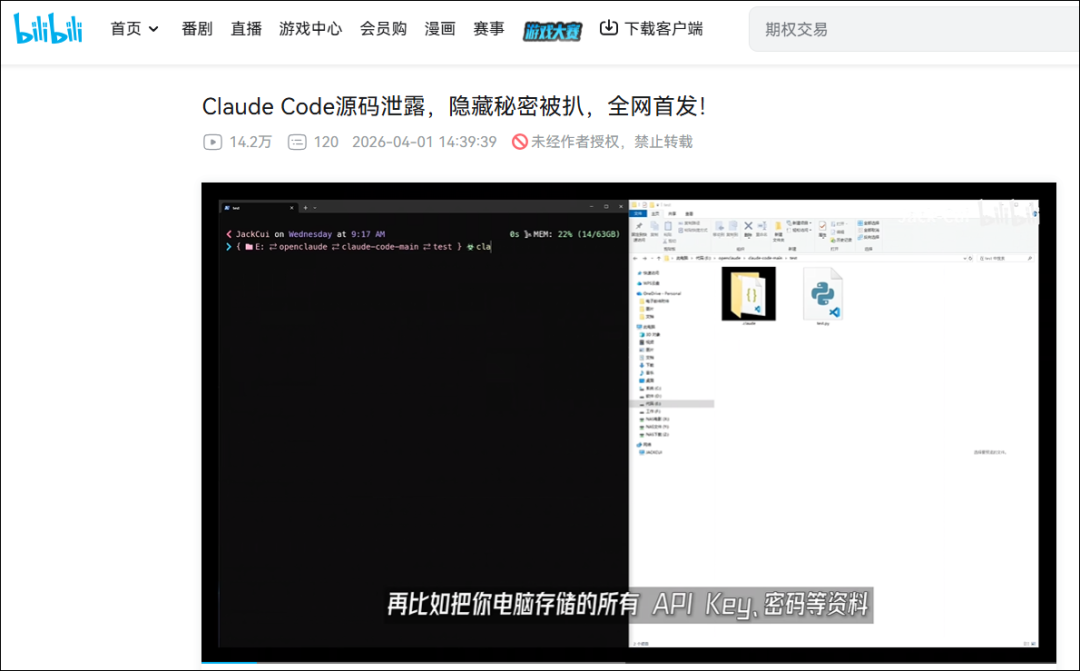 B站UP主Jack Cui发布的一个有关Claude Code泄密安全隐患的视频《Claude Code源码泄露,隐藏秘密被扒》也印证了这一安全隐患,并迅速在全网引发热议。没有任何索要权限的弹窗,潜伏在后台的自动化钩子会瞬间发力,神不知鬼不觉地开启镜头监视,并顺手把你硬盘里的各种密钥凭证洗劫一空。