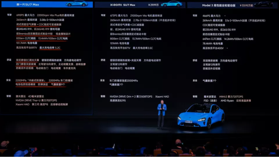对于能耗上的差距,小米并没有回避。在新一代SU7的发布会上,小米在产品介绍的PPT里特意强调,Model 3后驱版和长续航后驱版的CLTC电耗表现,分别优于新一代SU7标准版和Pro。但新一代SU7 Max的CLTC电耗为13.4kWh/100km,优于Model 3高性能四驱版。