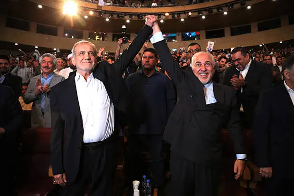 2024年6月19日,在伊朗德黑兰竞选会议上,马苏德·佩泽希齐扬和穆罕默德·贾瓦德·扎里夫(右)高举双手。 澎湃影像