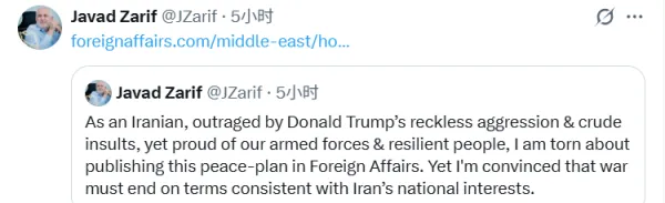 当天,扎里夫还在社交平台X上表示:“身为伊朗人,我对特朗普鲁莽的侵略行径与粗俗侮辱感到愤怒,但同时又为我们的军队和坚韧的人民感到自豪。因此,我对于是否要在《外交事务》上发表这份和平计划感到十分矛盾。但我坚信,战争必须以符合伊朗国家利益的方式结束。”