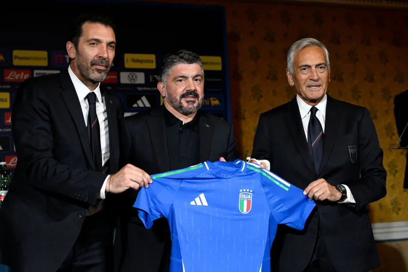 2025年6月19日,意大利罗马,意大利足协主席格拉维纳、意大利男足新任主教练加图索和意大利前国家队守门员布冯(从右至左)在新闻发布会后合影(图:新华社)
