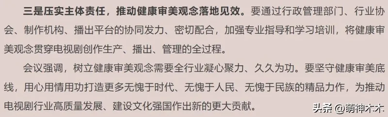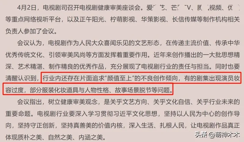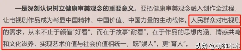 会议上第一点就提出要深刻认识树立健康审美观念的重要意义,观众对电视剧的需求从来不止在于表面的颜值,一部剧想出圈,想大爆,最重要的还是故事耐看。