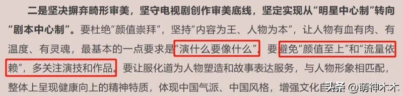会议第二点就是强调坚决摒弃畸形审美,坚守电视剧创作审美底线,坚定实现从“明星中心制”转向“剧本中心制”。明确提出杜绝“颜值崇拜”,坚持“内容为王,人物为本”,对演员出身没有限制,但最基本的要求是“演什么要像什么”。