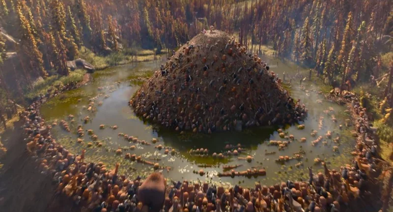 作为一部合家欢的动画电影,故事结尾不可避免地要扭转乾坤,完成圆满和解。一场意外燃起的森林大火,仿佛再现了一年前现实中的加州山火,既给所有生物带来灭顶之灾,也成为所有势力放下分歧、众志成城的契机。